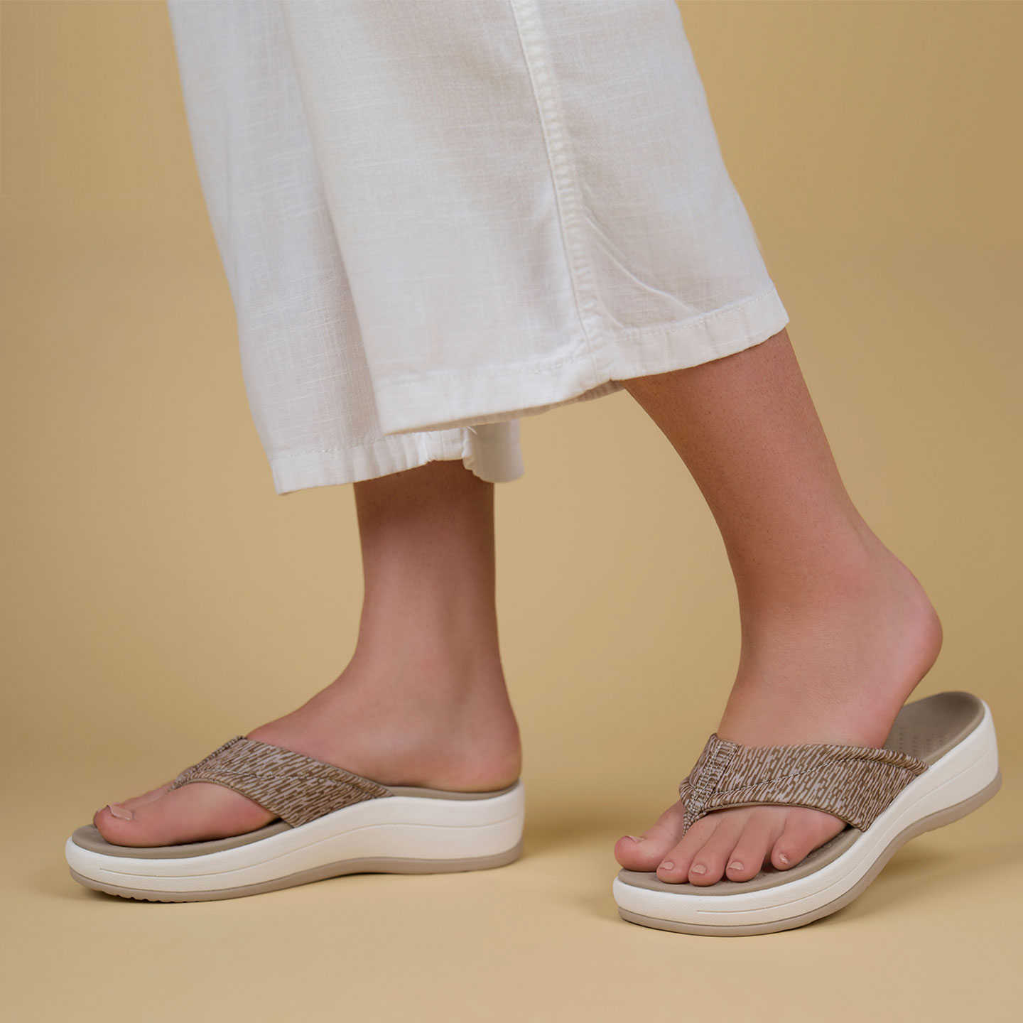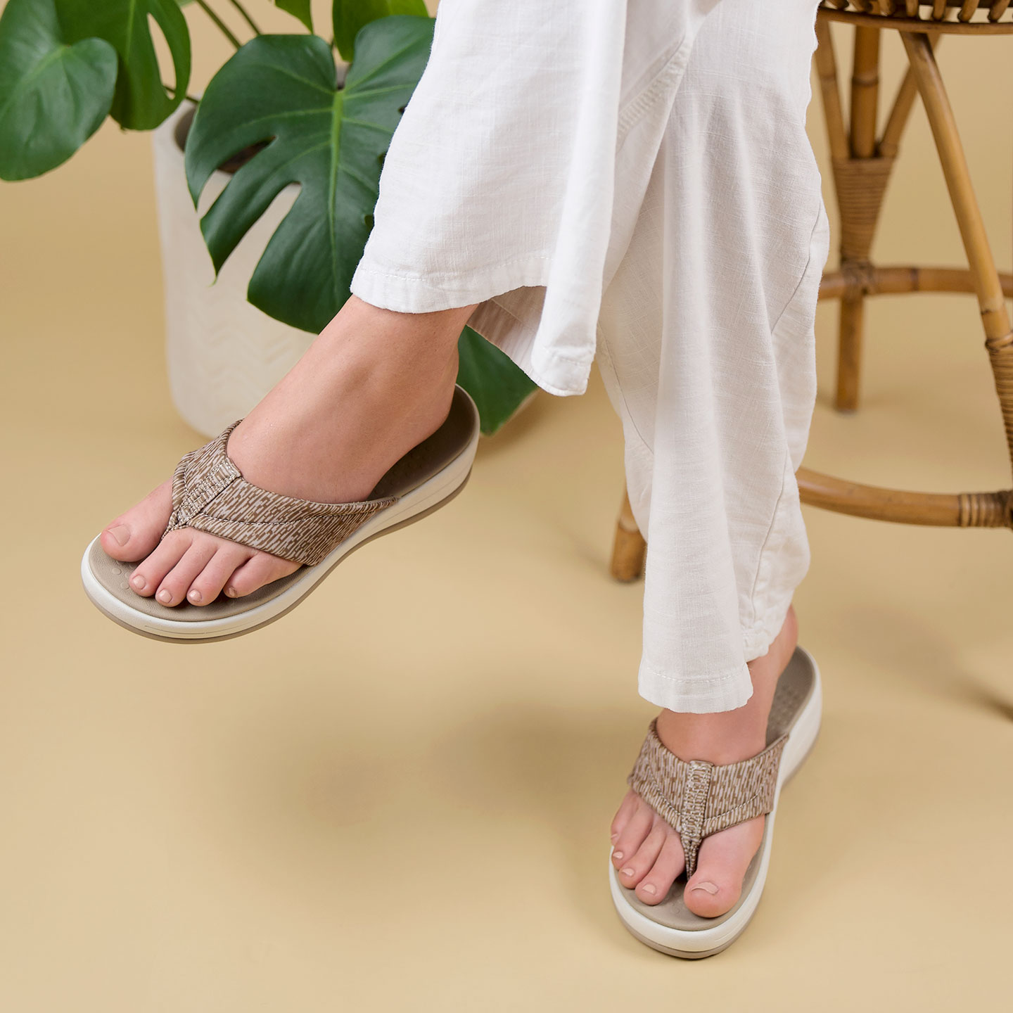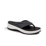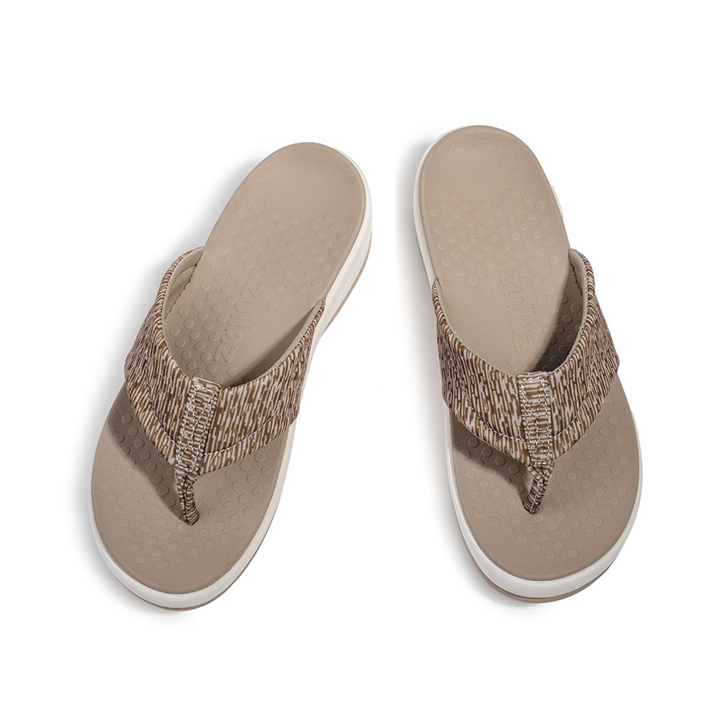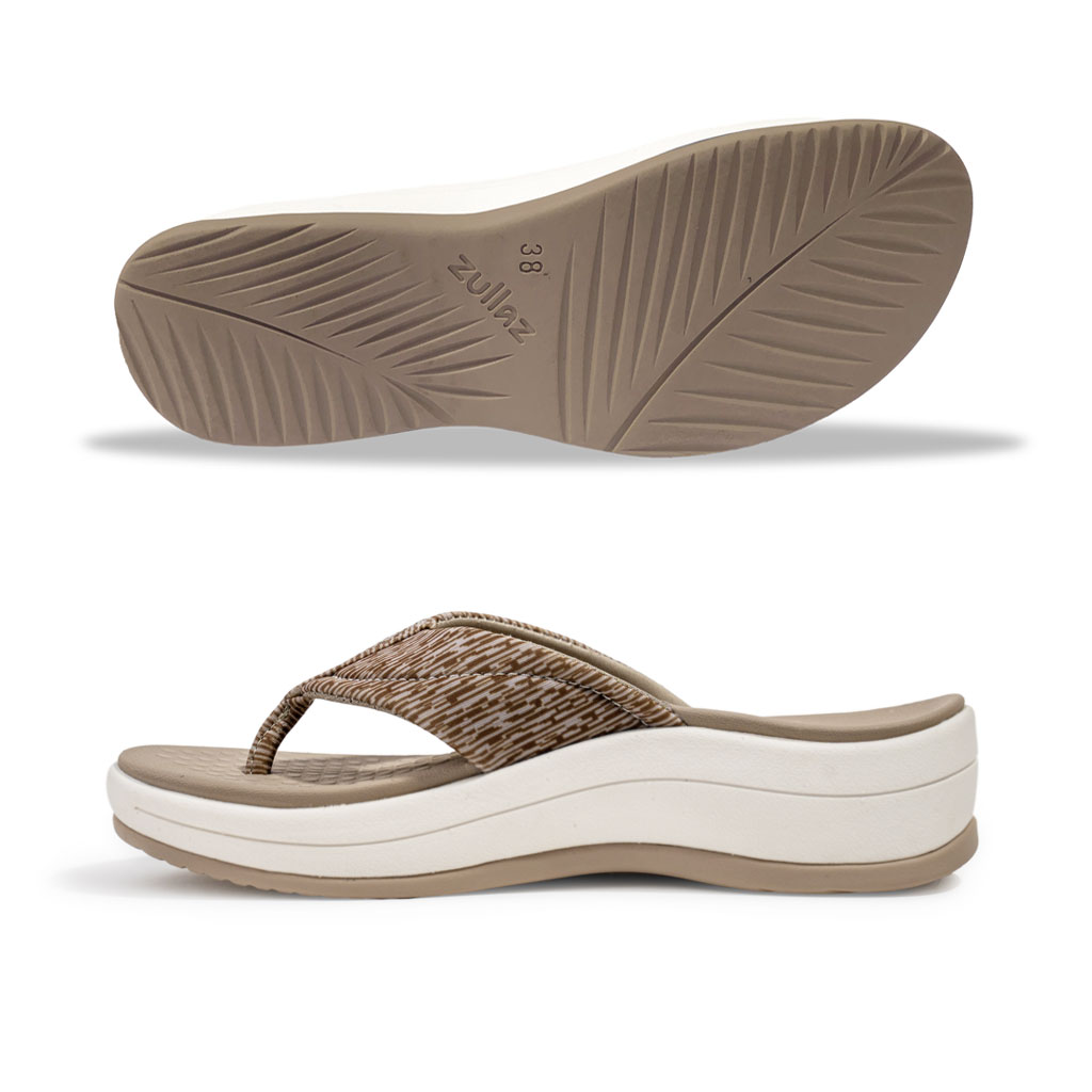 Zullaz ‘Emma’ womens toe post sandals with Footlogics arch support and ultra-cushioning footbed. Standard width and elevated heel.